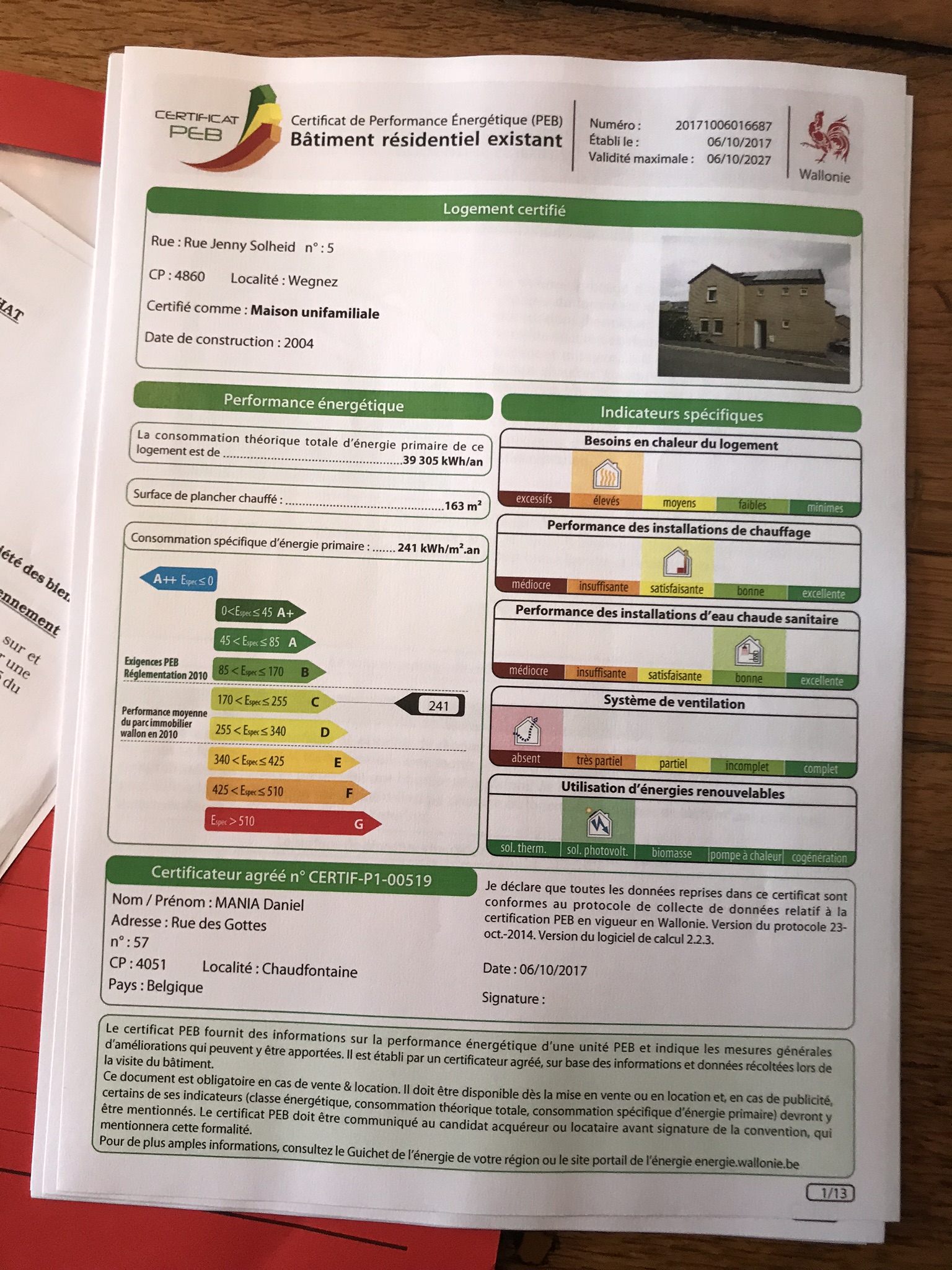 Valeur énergétique 241kWh/m²/an